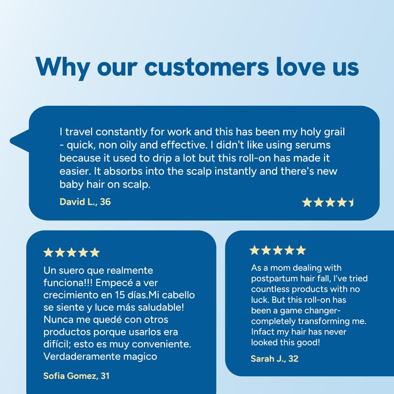Here's the truth: most hair growth treatments fail not because the formula doesn't work, but because people can't stick with them. Messy droppers that drip down your forehead. Greasy oils that make your hair look unwashed. Sprays that get everywhere except your scalp. We solved this with our precision roll-on applicator. It glides directly onto your scalp—parting your hair as you go—delivering the serum exactly where it's needed. No waste. No mess. No excuses. Just 30 seconds in the morning or evening, and you're done. That's the difference between a product that sits in your cabinet and one that actually delivers results.
